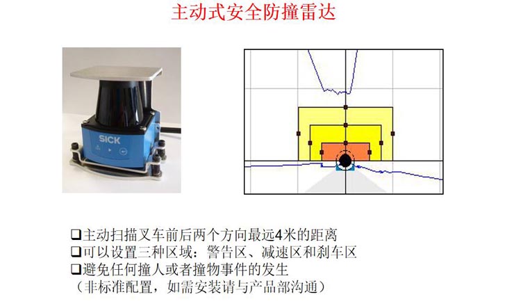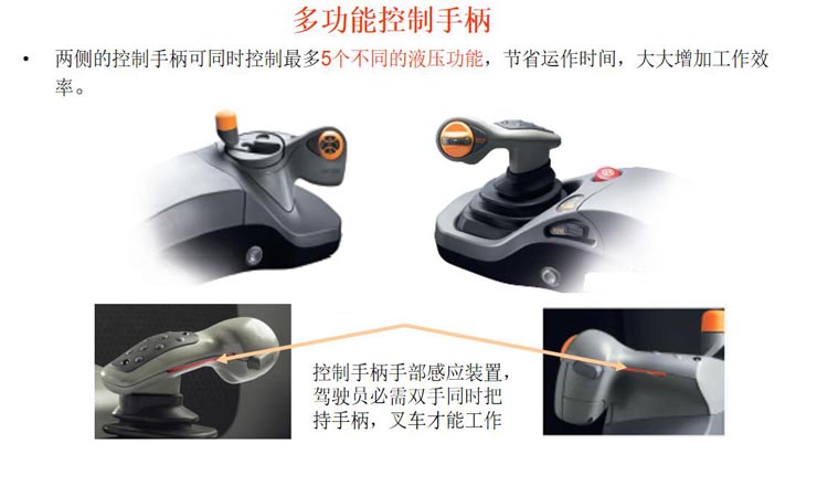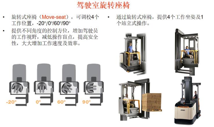 貨架間所需通道寬度只需略大于車身寬度即可,在巷道內(nèi)作業(yè)時叉車車身不用轉(zhuǎn)彎,叉車前段貨叉部分可以180度范圍內(nèi)左右轉(zhuǎn)換方向自由叉取貨物